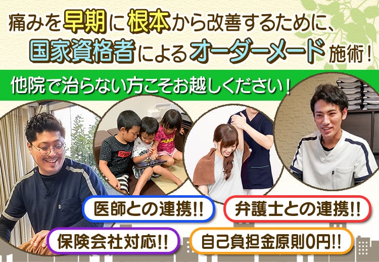 むちうちの痛みを一日でも早く、根本的に改善できるよう全力で施術させていただきますので、むちうちのお悩みは当院にご相談ください。